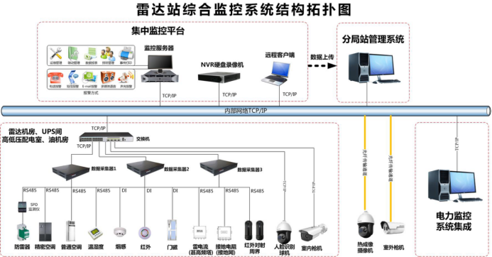 通過(guò)建設(shè)雷達(dá)站智能綜合監(jiān)控系統(tǒng)可以對(duì)分布在雷達(dá)站各個(gè)區(qū)域獨(dú)立的動(dòng)力設(shè)備和環(huán)境設(shè)施、安防設(shè)施對(duì)象進(jìn)行遙測(cè)、遙信等采集,實(shí)時(shí)監(jiān)視各基礎(chǔ)設(shè)施、安防設(shè)備的運(yùn)行狀態(tài),記錄和處理相關(guān)數(shù)據(jù),及時(shí)偵測(cè)故障,并作必要的遙調(diào)、遙控操作,適時(shí)通知管理人員處理,結(jié)合先進(jìn)的視頻監(jiān)控系統(tǒng),對(duì)雷達(dá)站進(jìn)行可視化監(jiān)測(cè),實(shí)現(xiàn)雷達(dá)站的少人、無(wú)人值守,以及電源、空調(diào)的集中監(jiān)控維護(hù)管理,提高供電系統(tǒng)的可靠性和通信設(shè)備的安全性,為雷達(dá)站的管理自動(dòng)化、運(yùn)行智能化和決策科學(xué)化提供有力的技術(shù)支持。