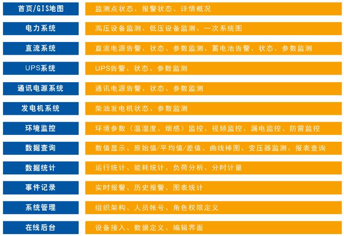 綜合監(jiān)控管理系統(tǒng)包括:電力監(jiān)控系統(tǒng)、工藝配電監(jiān)控系統(tǒng)和工作環(huán)境監(jiān)控系統(tǒng)三個獨立的子系統(tǒng)。綜合監(jiān)控管理系統(tǒng)包括對高低壓配電柜、變壓器、柴油發(fā)電機組設備的監(jiān)控;工藝配電監(jiān)控系統(tǒng)包括對UPS,蓄電池的監(jiān)控;工作環(huán)境監(jiān)控系統(tǒng)包括溫濕度、煙感、水浸等環(huán)境傳感器的參數(shù)監(jiān)測,以及視頻監(jiān)控、門禁監(jiān)控、防雷監(jiān)控、漏電監(jiān)測等安防安全監(jiān)控設備的實時監(jiān)控,實現(xiàn)對機房系統(tǒng)外部環(huán)境工作狀態(tài)的監(jiān)測。